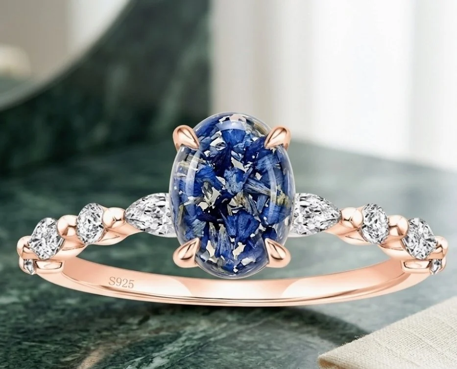 This elegant oval-cut ring features a center stone, created entirely from your special inclusion. Set on a dainty twisted band with sparkling accents, this design is both timeless and deeply meaningful. Whether it holds flowers from a wedding, ashes of a loved one, or another cherished element, this ring transforms your most important moments into something you can carry with you every day.
